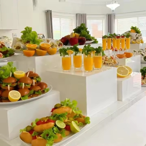 Buffet di lusso Hotel vendita Base acrilico espositore cibo acrilico Buffet cubo bianco Display acrilico festa di nozze
